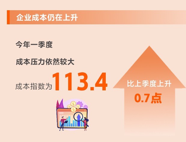 全球通脹仍處于高位,美聯(lián)儲急速加息對世界經濟影響的外溢效應持續(xù)顯現(xiàn)。中小企業(yè)多位于產業(yè)鏈下游且面對消費者,需求疲弱情況下難以轉嫁上游原材料價格上漲的壓力,同時還面臨人力成本上行以及房屋租金較高等困難。一季度,成本指數(shù)為113.4,比上季度上升0.7點,仍處于不景氣區(qū)間,說明成本壓力依然較大。所調查的8個行業(yè)中,7個行業(yè)生產成本指數(shù)、8個行業(yè)勞動力成本指數(shù)均上升。