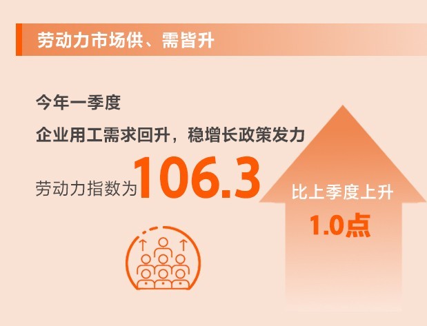 隨著生產生活秩序的恢復,人員流動性的提高,企業(yè)用工需求開始回升,同時穩(wěn)增長政策持續(xù)發(fā)力,從業(yè)人數(shù)有所上升。一季度,勞動力指數(shù)為106.3,比上季度上升1.0點。其中,供應指數(shù)為113.6,比上季度上升0.1點;需求指數(shù)為98.9,比上季度上升1.9點。