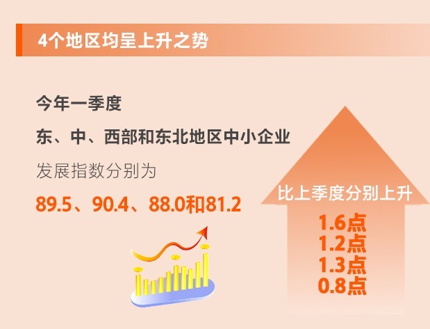 一季度,東、中、西部和東北地區(qū)中小企業(yè)發(fā)展指數(shù)分別為89.5、90.4、88.0和81.2,比上季度分別上升1.6、1.2、1.3和0.8點,東部地區(qū)指數(shù)上升幅度最大,中部地區(qū)指數(shù)最高,說明東部和中部地區(qū)經濟和中小微企業(yè)恢復較快。