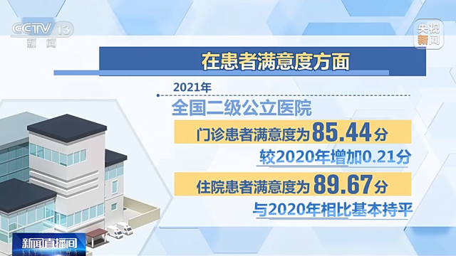 在患者滿意度方面,2021年,全國(guó)二級(jí)公立醫(yī)院門診患者滿意度為85.44分,較2020年增加0.21分,住院患者滿意度為89.67分,與2020年相比基本持平。