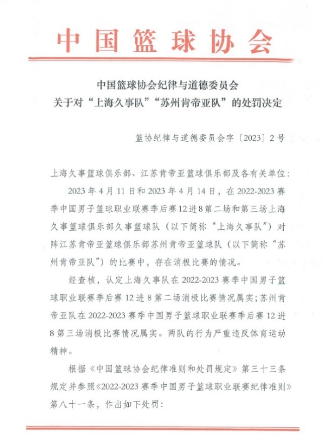 央視網(wǎng)消息:據(jù)@中國籃球協(xié)會 微博消息,4月17日,中國籃球協(xié)會紀(jì)律與道德委員會公布關(guān)于對“上海久事隊”“蘇州肯帝亞隊”的處罰決定。