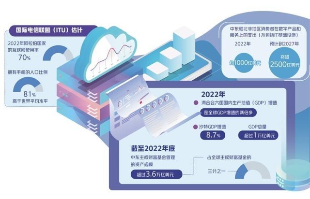 其次,中東消費者對互聯(lián)網(wǎng)、大數(shù)據(jù)、金融科技、新能源等高科技產(chǎn)品和服務(wù)有著旺盛需求,而且有較高的收入水平和支付能力。據(jù)國際電信聯(lián)盟(ITU)估計,2022年阿拉伯國家的互聯(lián)網(wǎng)使用率達70%,擁有手機的人口比例為81%,高于世界平均水平(73%)。據(jù)估計,2022年,中東和北非地區(qū)消費者在數(shù)字產(chǎn)品和服務(wù)上的支出(不包括IT基礎(chǔ)設(shè)施)約為1000億美元,預(yù)計到2027年將超過2500億美元。