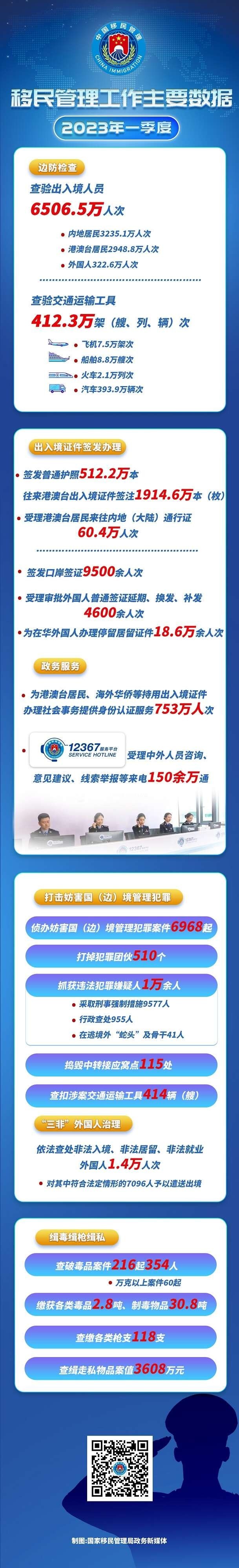 一季度,全國移民管理機(jī)構(gòu)查驗(yàn)交通運(yùn)輸工具412.3萬架(艘、列、輛)次,其中飛機(jī)7.5萬架次,船舶8.8萬艘次,火車2.1萬列次,汽車393.9萬輛次;簽發(fā)普通護(hù)照512.2萬本、往來港澳臺(tái)出入境證件簽注1914.6萬本(枚),受理港澳臺(tái)居民來往內(nèi)地(大陸)通行證60.4萬人次;簽發(fā)口岸簽證9500余人次,受理審批外國人普通簽證延期、換發(fā)、補(bǔ)發(fā)4600余人次,為在華外國人辦理停留居留證件18.6萬余人次;為港澳臺(tái)居民、海外華僑等持用出入境證件辦理社會(huì)事務(wù)提供身份認(rèn)證服務(wù)753萬人次,12367服務(wù)平臺(tái)受理中外人員咨詢、意見建議、線索舉報(bào)等來電150余萬通。