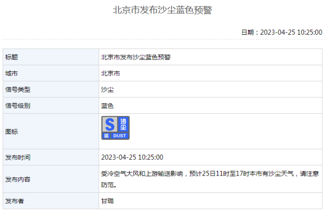 2023年04月25日10時25分,北京市氣象臺發(fā)布沙塵藍(lán)色預(yù)警。