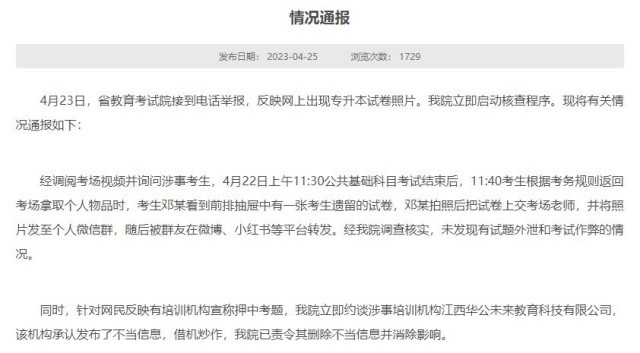 經(jīng)調(diào)閱考場視頻并詢問涉事考生,4月22日上午11:30公共基礎科目考試結(jié)束后,11:40考生根據(jù)考務規(guī)則返回考場拿取個人物品時,考生鄧某看到前排抽屜中有一張考生遺留的試卷,鄧某拍照后把試卷上交考場老師,并將照片發(fā)至個人微信群,隨后被群友在微博、小紅書等平臺轉(zhuǎn)發(fā)。經(jīng)江西省教育考試院調(diào)查核實,未發(fā)現(xiàn)有試題外泄和考試作弊的情況。