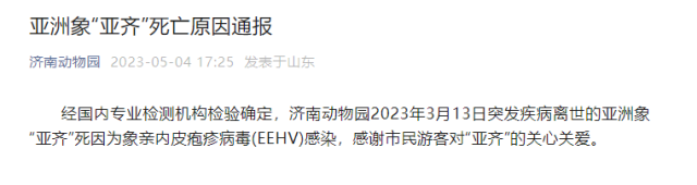央視網(wǎng)消息:5月4日,濟南動物園公眾號通報亞洲象“亞齊”死亡原因。 經(jīng)國內專業(yè)檢測機構檢驗確定,濟南動物園2023年3月13日突發(fā)疾病離世的亞洲象“亞齊”死因為象親內皮皰疹病毒(EEHV)感染,感謝市民游客對“亞齊”的關心關愛。
