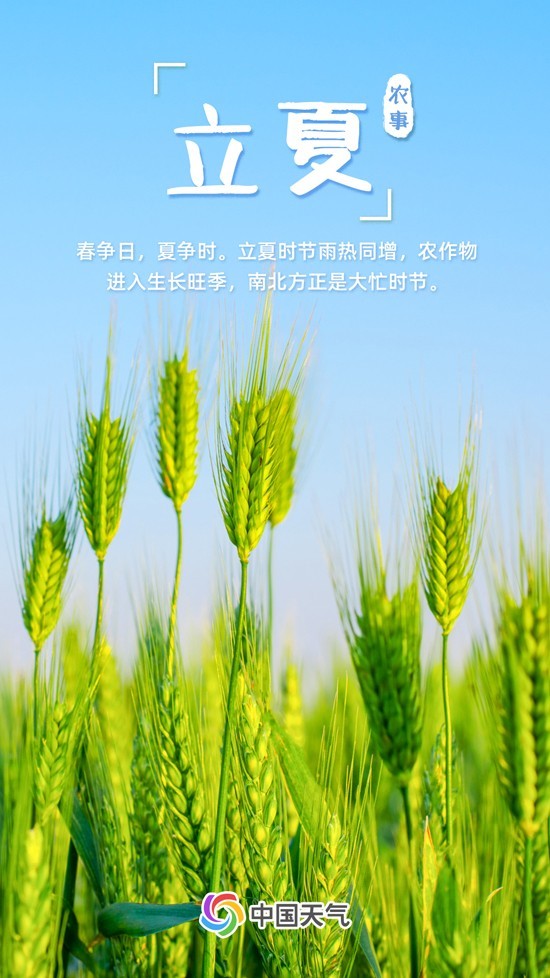 如果說春是生的季節(jié),那么夏就是長(zhǎng)的季節(jié)?!稓v書》曰:“斗指東南,維為立夏,萬物至此皆長(zhǎng)大,故名立夏也?!绷⑾?,是標(biāo)示萬物進(jìn)入旺季生長(zhǎng)的一個(gè)重要節(jié)氣。此時(shí),日照增加、氣溫漸升、雷雨增多,農(nóng)作物進(jìn)入了茁壯成長(zhǎng)階段。春播作物漸漸長(zhǎng)大,夏收作物進(jìn)入生長(zhǎng)后期,冬小麥揚(yáng)花灌漿,油菜接近成熟,大江南北都進(jìn)入了農(nóng)事繁忙時(shí)期。