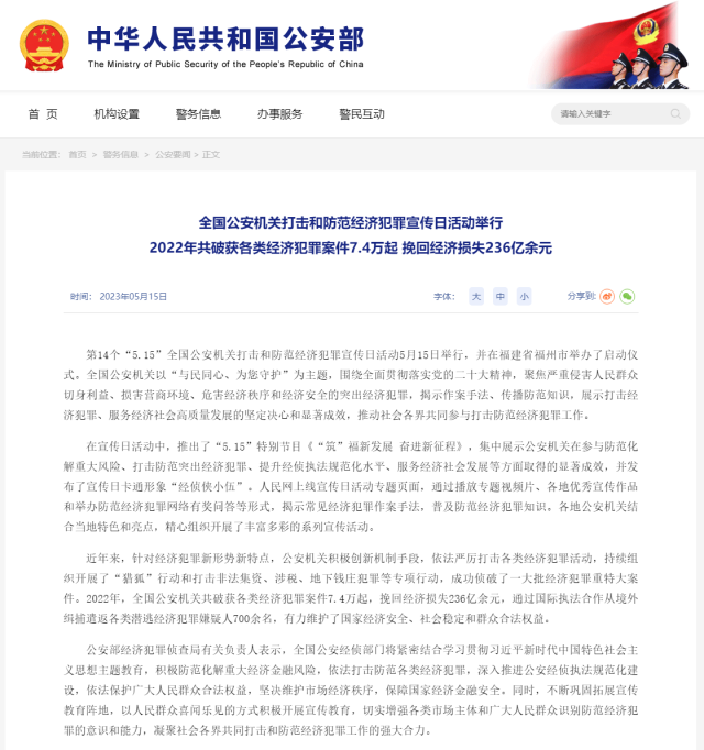 公安部:2022年共破獲各類經(jīng)濟(jì)犯罪案件7.4萬起