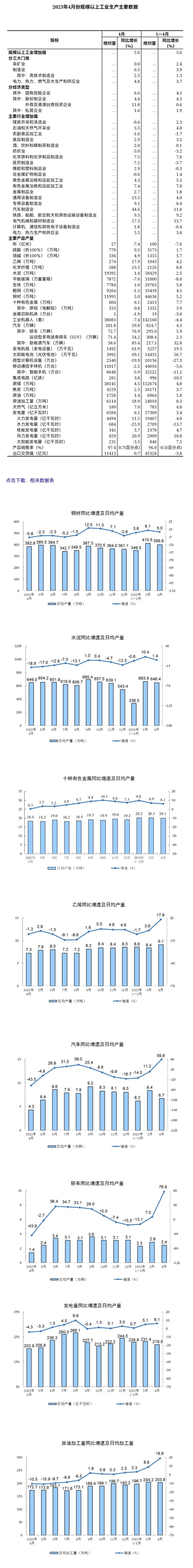 分產(chǎn)品看,4月份,620種產(chǎn)品中有358種產(chǎn)品產(chǎn)量同比增長(zhǎng)。其中,鋼材11995萬(wàn)噸,同比增長(zhǎng)5.0%;水泥19392萬(wàn)噸,增長(zhǎng)1.4%;十種有色金屬604萬(wàn)噸,增長(zhǎng)6.1%;乙烯274萬(wàn)噸,增長(zhǎng)17.9%;汽車(chē)201.8萬(wàn)輛,增長(zhǎng)59.8%,其中新能源汽車(chē)58.6萬(wàn)輛,增長(zhǎng)85.4%;發(fā)電量6584億千瓦時(shí),同比增長(zhǎng)6.1%;原油加工量6114萬(wàn)噸,同比增長(zhǎng)18.9%。