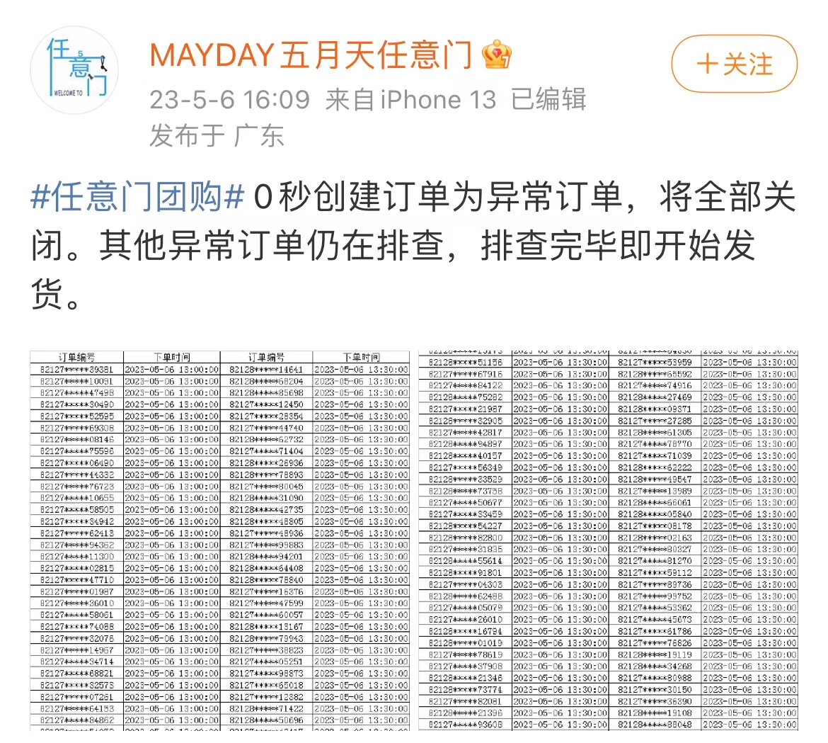 5月6日晚,五月天粉絲團票的最后一日,“MAYDAY五月天任意門”粉絲站在社交媒體公布大量0秒異常訂單,并表示異常訂單將全部關閉,排查完畢后即開始發(fā)貨。然而不足3個小時,一則團票取消的通知讓粉絲們剛剛搶到票的喜悅消失殆盡。