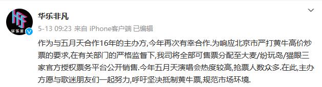 5月13日,華樂非凡在官方微博發(fā)布聲明,五月天演唱會全部可售票是在有關部門的嚴格監(jiān)督下,分配至官方授權(quán)票務平臺公開銷售。然而對于這則聲明粉絲們并不買賬,評論區(qū)里有粉絲詢問“不可售”的票去哪兒了?