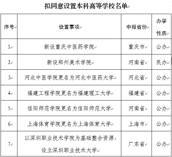 教育部擬同意設(shè)置7所本科高等學(xué)校(公示名單)