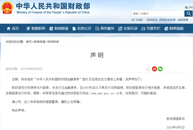 財政部發(fā)布聲明:未發(fā)行過金融債券,1997年后已不再發(fā)行實物國債