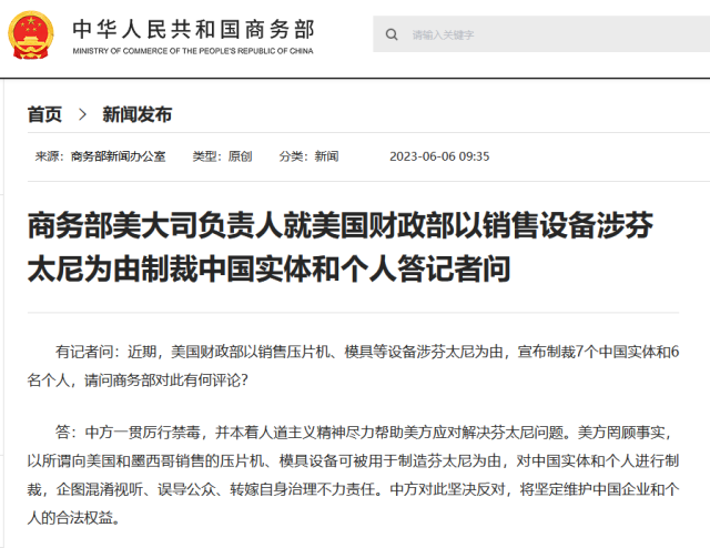 有記者問(wèn):近期,美國(guó)財(cái)政部以銷售壓片機(jī)、模具等設(shè)備涉芬太尼為由,宣布制裁7個(gè)中國(guó)實(shí)體和6名個(gè)人,請(qǐng)問(wèn)商務(wù)部對(duì)此有何評(píng)論?