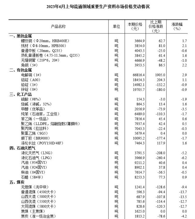 2023年6月上旬流通領(lǐng)域重要生產(chǎn)資料市場(chǎng)價(jià)格變動(dòng)情況