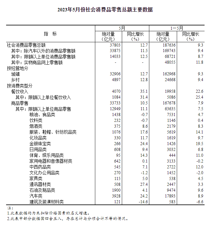 國(guó)家統(tǒng)計(jì)局公布數(shù)據(jù),5月份,社會(huì)消費(fèi)品零售總額37803億元,同比增長(zhǎng)12.7%。其中,除汽車以外的消費(fèi)品零售額33875億元,增長(zhǎng)11.5%。