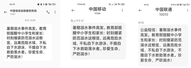中國青年報客戶端北京7月13日電(中青報·中青網(wǎng)記者 樊未晨)記者今天從教育部獲悉,暑假來臨,教育部、工信部協(xié)調(diào)中國電信、中國移動、中國聯(lián)通三大運營商,向全國手機用戶發(fā)送了暑期防溺水公益短信,提醒廣大中小學生和家長增強安全意識,營造全社會關心支持預防學生溺水工作良好氛圍。