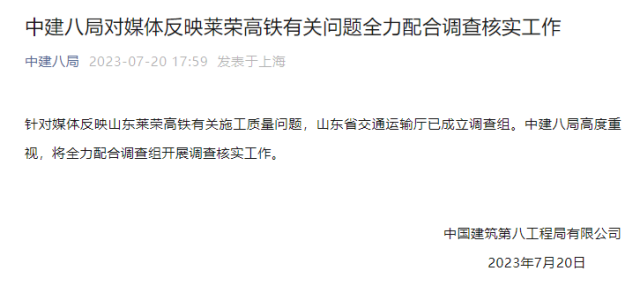 央視網(wǎng)消息:據(jù)“中建八局”公眾號消息,中國建筑第八工程局有限公司表示,針對媒體反映山東萊榮高鐵有關(guān)施工質(zhì)量問題,山東省交通運(yùn)輸廳已成立調(diào)查組。中建八局高度重視,將全力配合調(diào)查組開展調(diào)查核實(shí)工作。