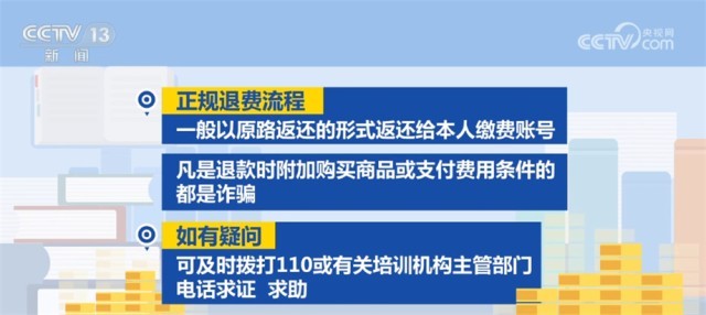 正規(guī)退費流程一般以原路返還的形式返還給本人繳費賬號,凡是退款時附加購買商品或支付費用條件的都是詐騙。如有疑問,可及時撥打110或有關(guān)培訓(xùn)機構(gòu)主管部門電話求證、求助。