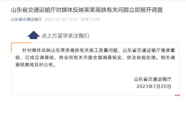 針對(duì)媒體反映山東萊榮高鐵有關(guān)施工質(zhì)量問題,山東省交通運(yùn)輸廳高度重視,已成立調(diào)查組,將會(huì)同有關(guān)方面全面調(diào)查核實(shí),依法依規(guī)處理。相關(guān)調(diào)查結(jié)果將及時(shí)公布。