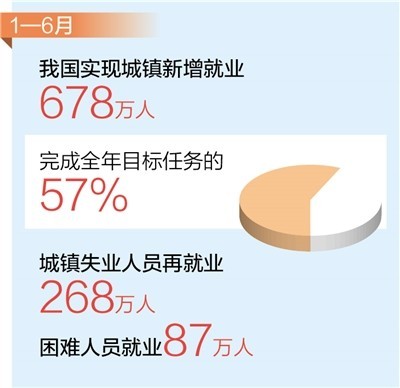 前6月,我國(guó)實(shí)現(xiàn)城鎮(zhèn)新增就業(yè)678萬(wàn)人,完成全年目標(biāo)任務(wù)的57% 就業(yè)形勢(shì)保持總體穩(wěn)定