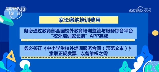 家長(zhǎng)繳納培訓(xùn)費(fèi)用,務(wù)必通過教育部全國校外教育培訓(xùn)監(jiān)管與服務(wù)綜合平臺(tái)“校外培訓(xùn)家長(zhǎng)端”APP完成;務(wù)必簽訂《中小學(xué)生校外培訓(xùn)服務(wù)合同(示范文本)》,索取正規(guī)發(fā)票,以備維權(quán)之需;務(wù)必控制額度,一次性繳費(fèi)不要超過3個(gè)月或60課時(shí),且不要超過5000元,切勿受“充值贈(zèng)送”等方式誘惑,繳納高額培訓(xùn)費(fèi)。