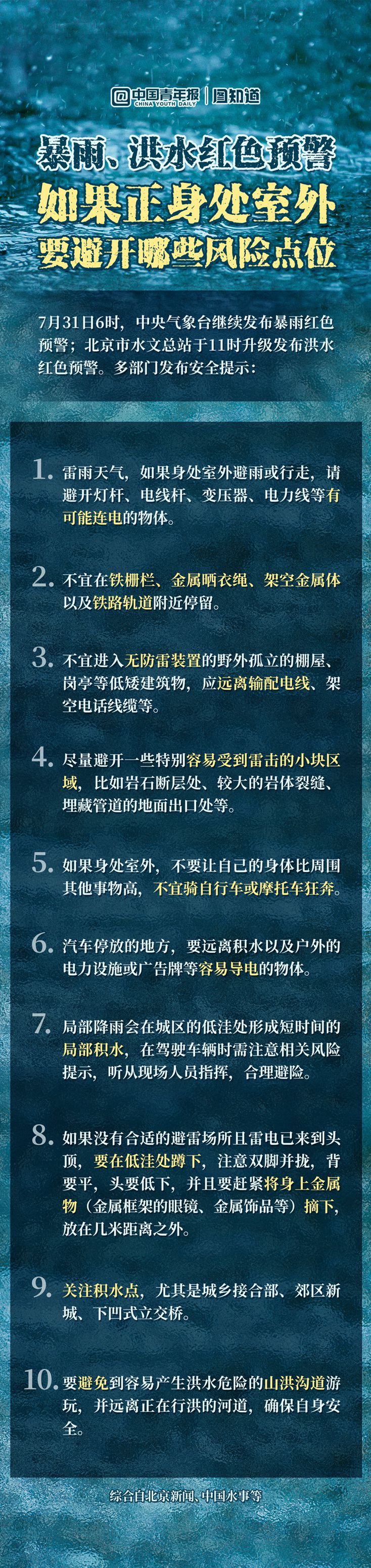 7月31日6時,中央氣象臺繼續(xù)發(fā)布暴雨紅色預(yù)警。北京市水文總站于當(dāng)日11時升級發(fā)布洪水紅色預(yù)警。如果遇到暴雨、洪水時恰好身處室外,應(yīng)避開哪些風(fēng)險點(diǎn)位?學(xué)習(xí)科普知識,安全度汛。