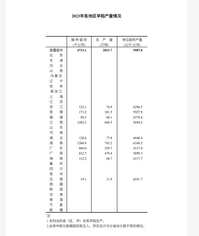 國(guó)家統(tǒng)計(jì)局今天發(fā)布數(shù)據(jù)顯示,2023年,全國(guó)早稻總產(chǎn)量566.7億斤,比2022年增加4.3億斤,增長(zhǎng)0.8%。全國(guó)早稻播種面積7099.7萬(wàn)畝,單位面積產(chǎn)量399.1公斤/畝,比2022年增加4.8公斤/畝,增長(zhǎng)1.2%。