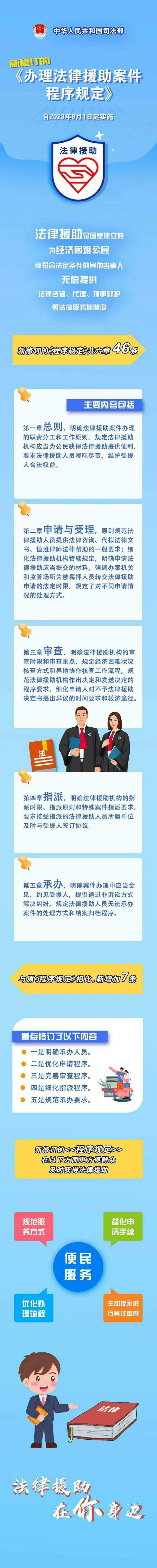 為貫徹落實法律援助法,提高法律援助案件辦理程序的標準化規(guī)范化水平,司法部對2012年公布并施行的《辦理法律援助案件程序規(guī)定》進行了全面修訂,修訂后的《程序規(guī)定》,在方便群眾及時獲得法律援助、提高法律援助服務質量等方面,作出了一系列具體規(guī)定?!冻绦蛞?guī)定》自2023年9月1日起施行。