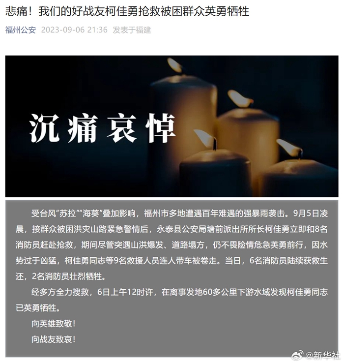 受臺風(fēng)“蘇拉”“??悲B加影響,福州市多地遭遇百年難遇的強暴雨襲擊。9月5日凌晨,接群眾被困洪災(zāi)山路緊急警情后,永泰縣公安局塘前派出所所長柯佳勇立即和8名消防員趕赴搶救,期間盡管突遇山洪暴發(fā)、道路塌方,仍不畏險情危急英勇前行,因水勢過于兇猛,柯佳勇同志等9名救援人員連人帶車被卷走。當日,6名消防員陸續(xù)獲救生還,2名消防員壯烈犧牲。經(jīng)多方全力搜救,6日上午12時許,在離事發(fā)地60多公里下游水域發(fā)現(xiàn)柯佳勇同志已英勇犧牲。(記者:王成 來源:福州公安)