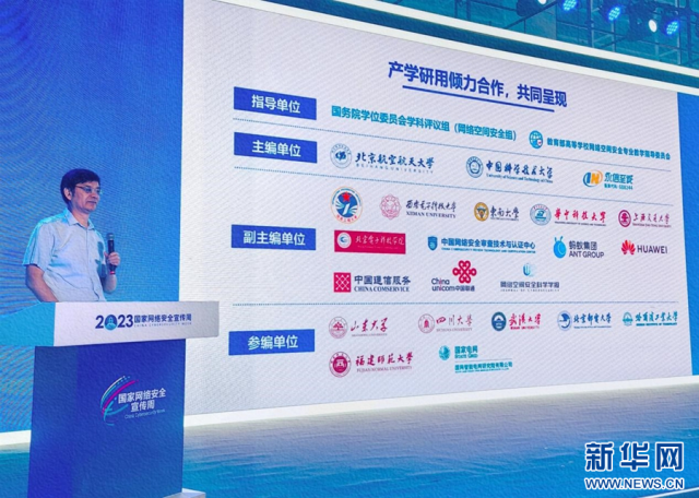 教育部高等學(xué)校網(wǎng)絡(luò)空間安全專業(yè)教學(xué)指導(dǎo)委員會(huì)副主任委員、中國科學(xué)技術(shù)大學(xué)網(wǎng)絡(luò)安全學(xué)院執(zhí)行院長俞能海在現(xiàn)場發(fā)布白皮書。新華網(wǎng)發(fā)(主辦方供圖)