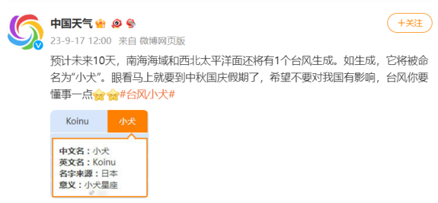 央視網(wǎng)消息:據(jù)@中國天氣 微博消息,預計未來10天,南海海域和西北太平洋面還將有1個臺風生成。如生成,它將被命名為“小犬”。