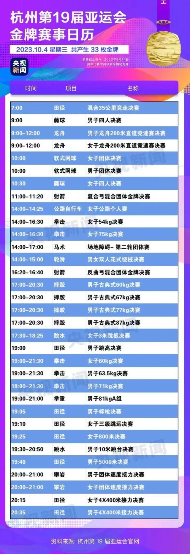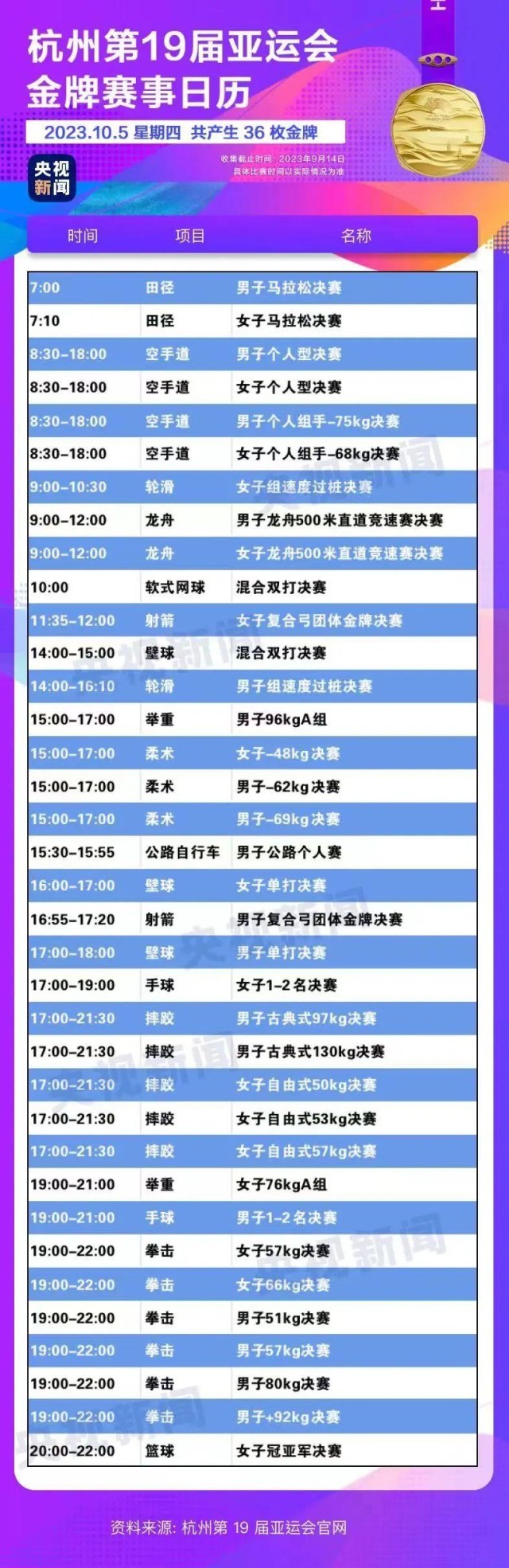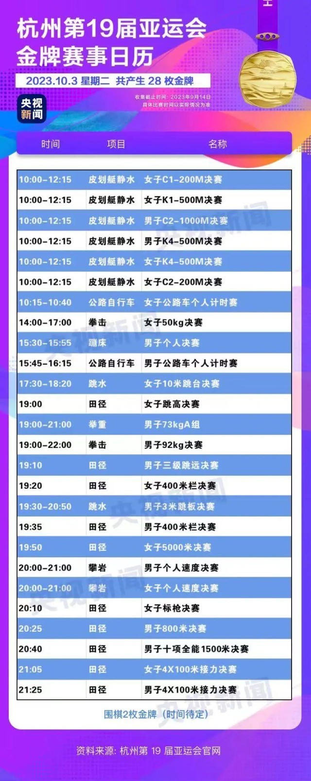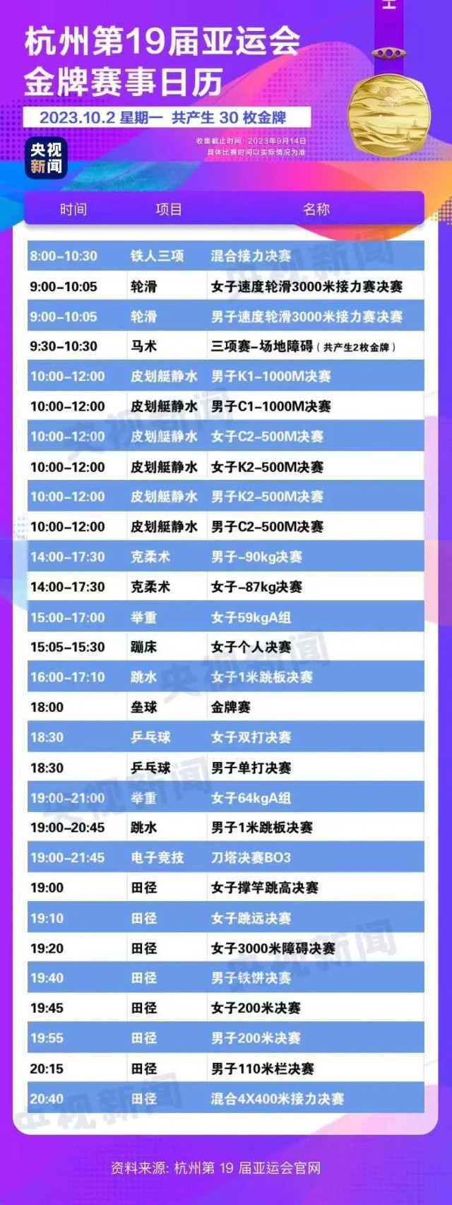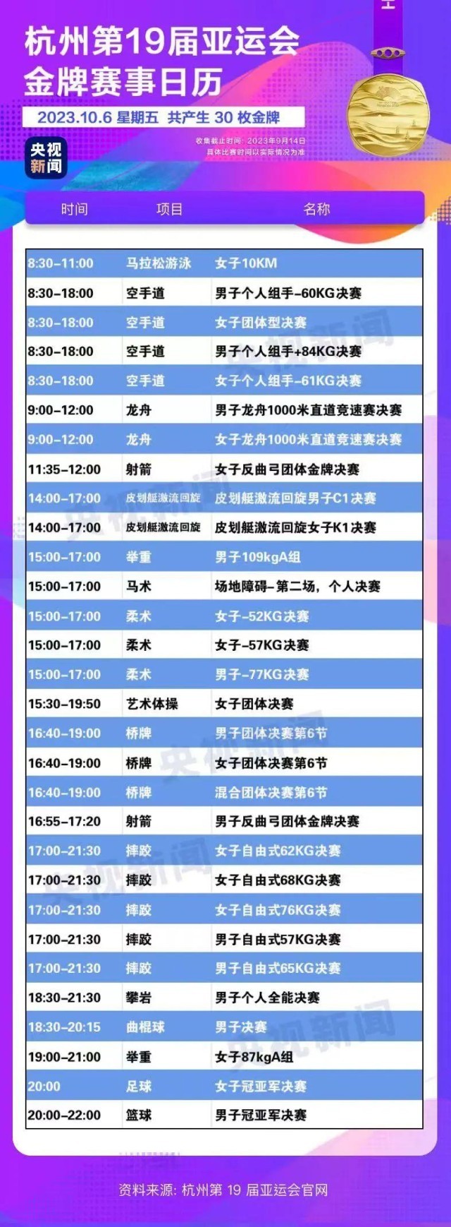 最后,小編還為你準(zhǔn)備了一份杭州亞運(yùn)會(huì)金牌賽事日歷,日歷里包含所有481枚金牌產(chǎn)生的時(shí)間?;瑒?dòng)手指,看看你關(guān)注的比賽在哪天舉行。