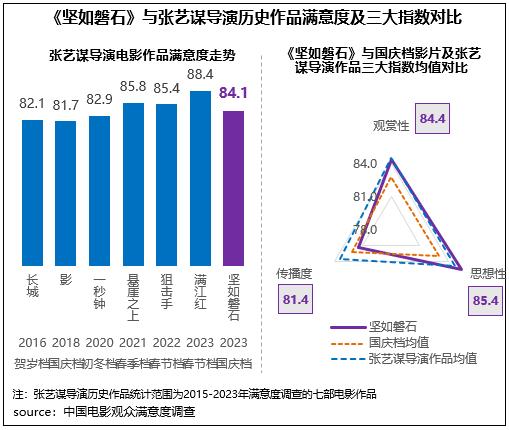 張藝謀導(dǎo)演新作《堅(jiān)如磐石》獲得觀眾滿意度評(píng)分84.1分,居2023年國慶檔調(diào)查五部影片首位,也是檔期內(nèi)唯一一部滿意度超84分的影片,保持了張藝謀導(dǎo)演系列電影作品的高滿意度水平。