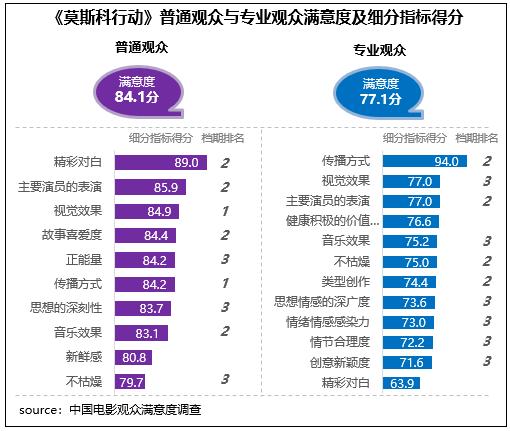 在不同觀眾評(píng)價(jià)上,《莫斯科行動(dòng)》相對(duì)更受普通觀眾青睞,普通觀眾滿意度得分84.1分,居檔期第二位,與《堅(jiān)如磐石》相差0.1分;專業(yè)觀眾滿意度得分77.1分,居檔期第三位。在細(xì)分指標(biāo)中,影片視覺效果和主要演員的表演均得到了不同觀眾的高度認(rèn)可,得分為各自評(píng)價(jià)指標(biāo)體系的前三名,也都居檔期五部影片的前三位。