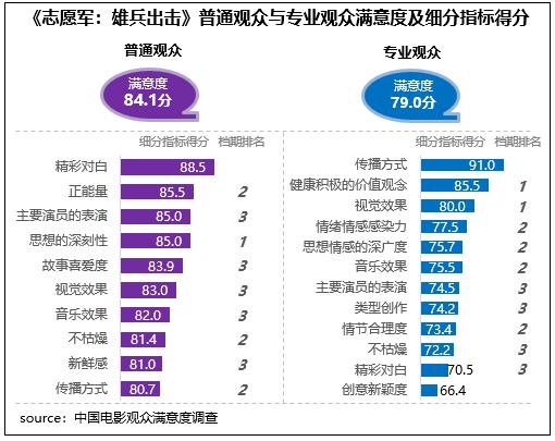在不同觀眾評(píng)價(jià)上,《志愿軍:雄兵出擊》相對(duì)更受專業(yè)觀眾青睞,專業(yè)觀眾滿意度得分79.0分,居檔期第二位;在細(xì)分指標(biāo)中,健康積極的價(jià)值觀念、視覺效果兩項(xiàng)指標(biāo)得分居檔期首位,同時(shí)分別居2023年調(diào)查50部影片的第4位和第8位。影片普通觀眾滿意度得分84.1分,居檔期第三位,僅比《堅(jiān)如磐石》和《93國際列車大劫案:莫斯科行動(dòng)》分別低0.1分、0.02分,細(xì)分指標(biāo)中思想深刻性得分居檔期首位。