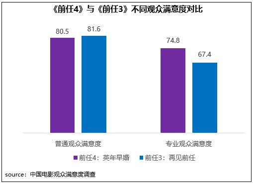 《前任4:英年早婚》在同系列影片輕松、寫實(shí)創(chuàng)作風(fēng)格基礎(chǔ)上,進(jìn)階到婚姻話題探討,并進(jìn)一步強(qiáng)化對(duì)觀眾現(xiàn)實(shí)情感生活的細(xì)致洞察,成為當(dāng)代人的愛情圖鑒。在不同觀眾評(píng)價(jià)中,影片相對(duì)更受專業(yè)觀眾的青睞,專業(yè)觀眾滿意度得分74.8分,高于上一部作品7.4分,其中精彩對(duì)白、傳播方式得分居檔期第二和第三位;但普通觀眾對(duì)其評(píng)價(jià)一般,滿意度得分80.5分,比上一部低1.1分。