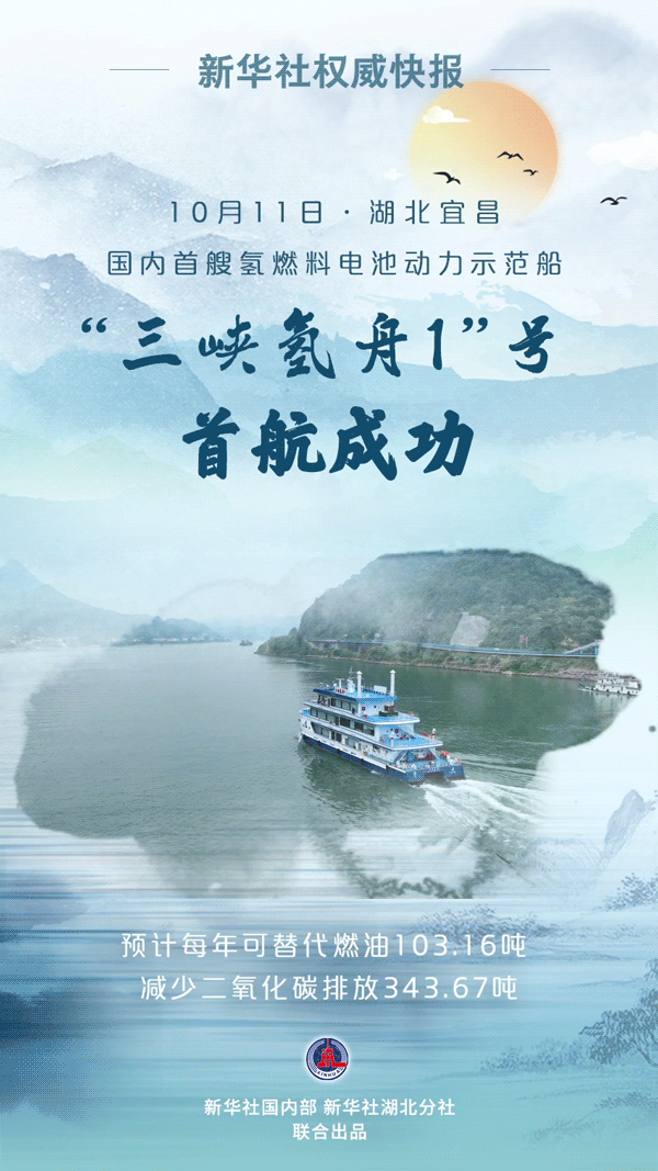 氫燃料電池動(dòng)力示范船“三峽氫舟1”號(hào)10月11日上午在湖北宜昌三峽游客中心(九碼頭)完成首航,這標(biāo)志著氫燃料電池技術(shù)在內(nèi)河船舶應(yīng)用實(shí)現(xiàn)零的突破。據(jù)測(cè)算,“三峽氫舟1”號(hào)相比傳統(tǒng)燃油動(dòng)力船舶,預(yù)計(jì)每年可替代燃油103.16噸,減少二氧化碳排放343.67噸。