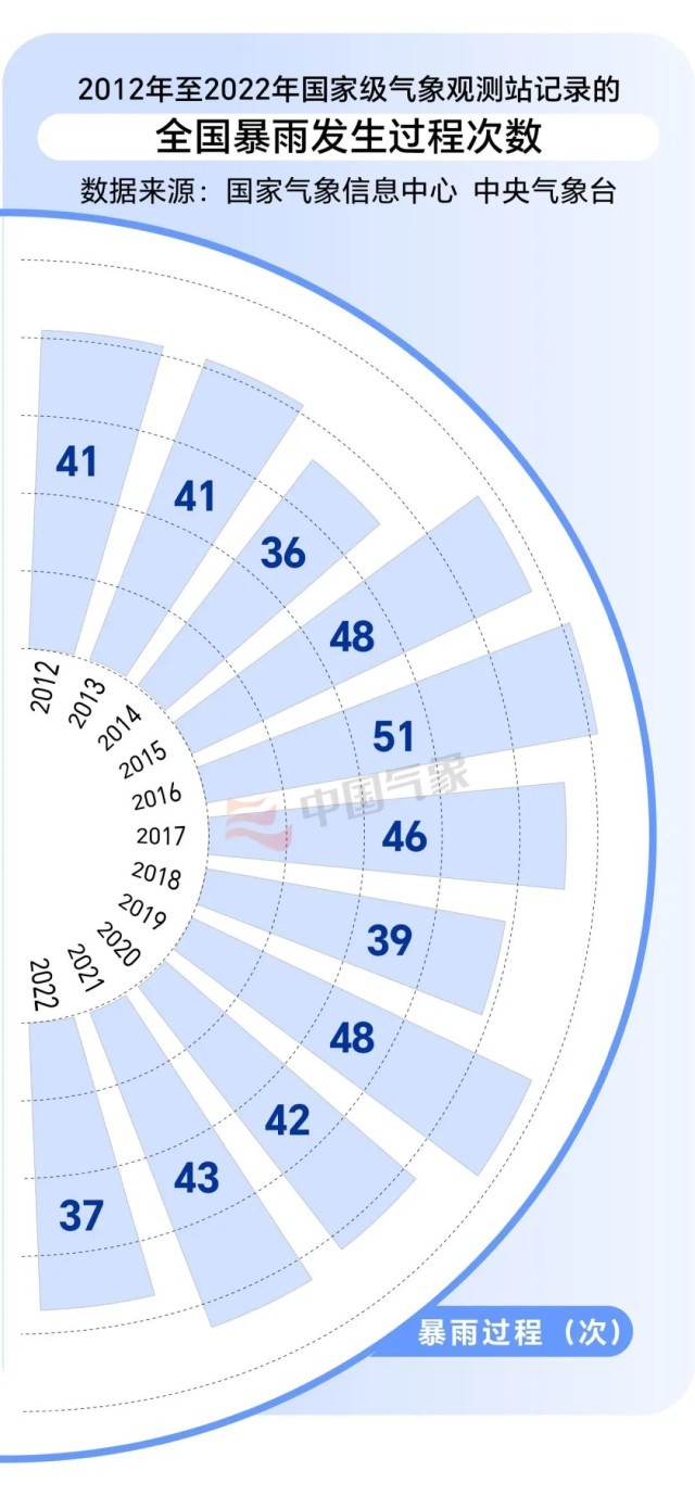 我們通過數(shù)據了解下我國近年來的暴雨發(fā)生頻次。2012年至2022年間,我國共發(fā)生暴雨天氣過程472次,年均發(fā)生次數(shù)約為42.9次;2016年暴雨發(fā)生次數(shù)最多,為51次;2014年最少,為36次(2023年未結束,暫不計)。