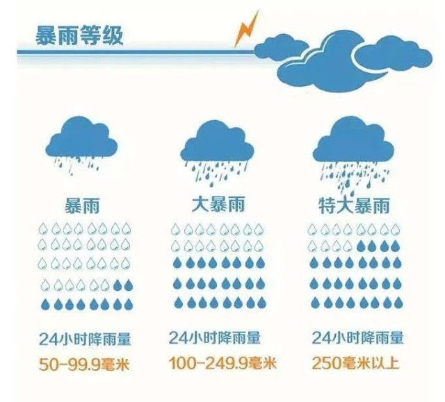 如果24小時降水量大于等于100毫米,那便達到了“大暴雨”等級;如果24小時降水量大于等于250毫米,就達到了“特大暴雨”等級。