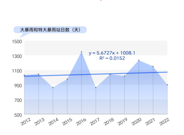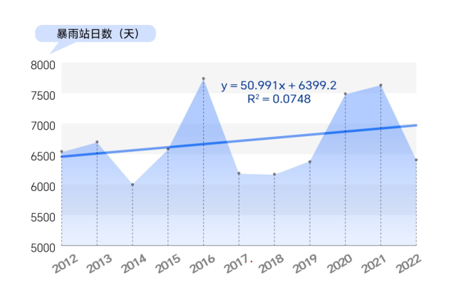 數(shù)據統(tǒng)計顯示,2012年至2022年,我國暴雨站日數(shù)有明顯的增加趨勢。這意味著,2012年到2022年,我國暴雨天氣過程的持續(xù)時間或影響范圍有增加(擴大)的趨勢。