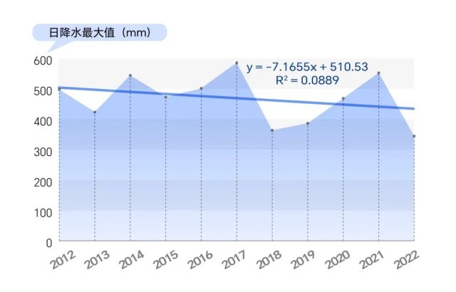 分析數(shù)據變化,可以看到,2012年到2022年我國日降水量最大值存在波動,總體有緩慢減少的趨勢。