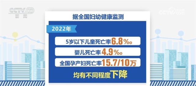 在婦幼健康方面,2022年我國孕產婦產前檢查率97.9%,產后訪視率96.5%。與上年比較,產前檢查率和產后訪視率均有提高。2022年全國住院分娩率為99.94%,基本實現全部住院分娩。據全國婦幼健康監(jiān)測,2022年,我國5歲以下兒童死亡率6.8‰,嬰兒死亡率4.9‰,全國孕產婦死亡率為15.7/10萬,均有不同程度下降。