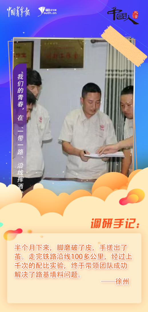一到任,徐州就面臨難題:項目部標段地層以火山巖等為主,沿線找不到符合標準的常規(guī)填料。如何改良“火山灰”?他帶領12名工作室成員,帶上試驗儀器,頭頂烈日,每天徒步十幾公里,對沿線土源進行取樣、分析。半個月下來,腳磨破了皮,手搓出了繭。走完鐵路沿線100多公里,經(jīng)過上千次的配比實驗,徐州帶領團隊成功解決了路基填料問題。