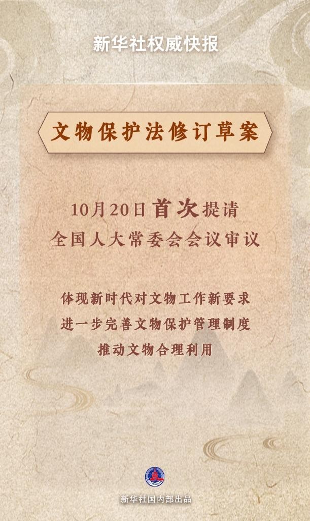 10月20日,文物保護(hù)法修訂草案提請十四屆全國人大常委會第六次會議首次審議。修訂草案貫徹黨中央決策部署,體現(xiàn)新時代對文物工作新要求;堅(jiān)持把保護(hù)放在第一位,進(jìn)一步完善文物保護(hù)管理制度;妥善處理保護(hù)和利用的關(guān)系,推動文物合理利用;多措并舉加大處罰力度,嚴(yán)厲打擊破壞文物違法行為。