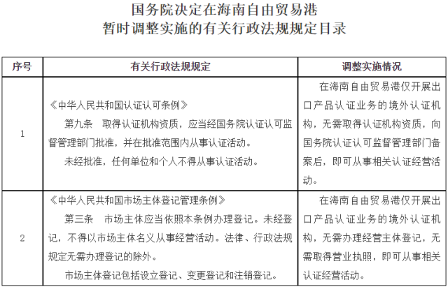 一、為支持海南自由貿(mào)易港建設(shè),按照《海南自由貿(mào)易港建設(shè)總體方案》,同意自即日起在海南自由貿(mào)易港暫時(shí)調(diào)整實(shí)施《中華人民共和國認(rèn)證認(rèn)可條例》《中華人民共和國市場(chǎng)主體登記管理?xiàng)l例》有關(guān)規(guī)定(目錄附后),在海南自由貿(mào)易港僅開展出口產(chǎn)品認(rèn)證業(yè)務(wù)的境外認(rèn)證機(jī)構(gòu),無需取得認(rèn)證機(jī)構(gòu)資質(zhì)和辦理經(jīng)營主體登記,向國務(wù)院認(rèn)證認(rèn)可監(jiān)督管理部門備案后,即可開展出口產(chǎn)品認(rèn)證業(yè)務(wù),認(rèn)證結(jié)果僅限出口企業(yè)境外使用。備案條件和程序由國務(wù)院認(rèn)證認(rèn)可監(jiān)督管理部門制定。