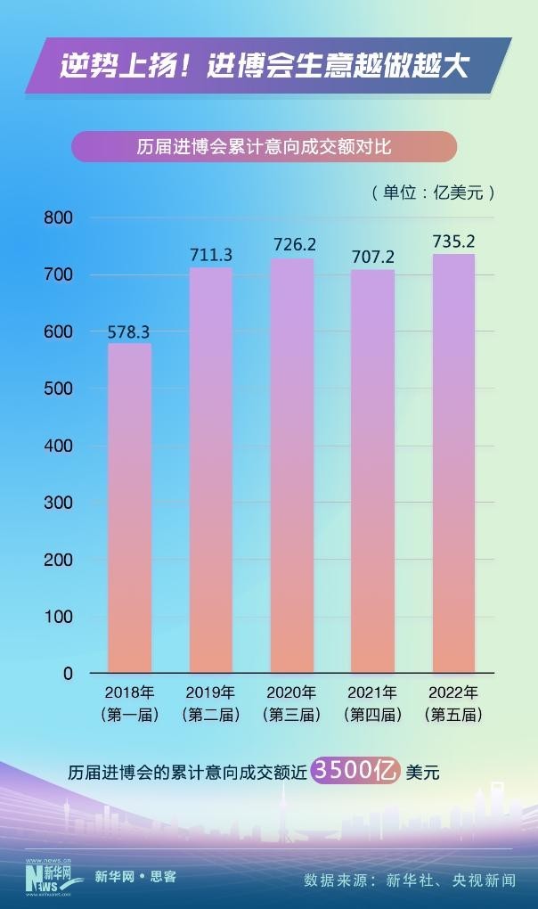2018年11月,首屆進(jìn)博會(huì)在上?!俺踉囂渎暋薄V?,進(jìn)博會(huì)不顧風(fēng)雨和險(xiǎn)阻,年年如約而至、越辦越好。數(shù)據(jù)顯示,進(jìn)博會(huì)的累計(jì)意向成交額從2018年的578.3億美元,上升到2022年的735.2億美元。前五屆進(jìn)博會(huì)的累計(jì)意向成交額近3500億美元。進(jìn)博會(huì)生意越做越大。