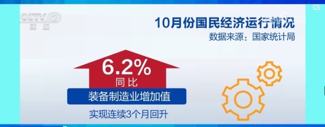 10月份,全國規(guī)模以上工業(yè)增加值比上月加快0.1個(gè)百分點(diǎn)。其中,裝備制造業(yè)增加值同比增長6.2%,比上月加快0.7個(gè)百分點(diǎn),連續(xù)3個(gè)月回升。