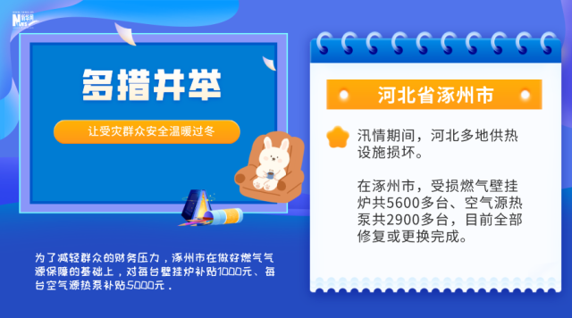 汛情期間,河北多地供熱設(shè)施損壞。在涿州市,受損燃氣壁掛爐共5600多臺、空氣源熱泵共2900多臺,目前全部修復(fù)或更換完成。為了減輕群眾的財務(wù)壓力,涿州市在做好燃氣氣源保障的基礎(chǔ)上,對每臺壁掛爐補貼1000元、每臺空氣源熱泵補貼5000元。在河北保定淶水縣,10個位于山區(qū)、丘陵的鄉(xiāng)鎮(zhèn)今冬要使用潔凈煤取暖,預(yù)計使用量在5.1萬噸左右。淶水縣督促相關(guān)企業(yè),早謀劃、早對接、早儲備,組織車輛加快配送,確保供得上、供得及時。