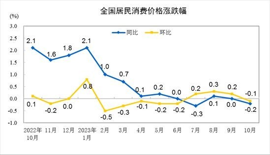 國家統(tǒng)計(jì)局?jǐn)?shù)據(jù)顯示,2023年10月,全國CPI環(huán)比下降0.1%,同比下降0.2%,同比時(shí)隔兩個(gè)月后再度出現(xiàn)負(fù)增長。